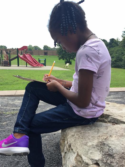 It feels like 105ºF, but the kids are outside anyway, propping clipboards on their hips, bending close to plants, and brushing their hands over leaves and stems. As they move from bed to bed, they draw pictures or write down what they find to complete their scavenger hunt, including something smooth, a plant with two colors and something bigger than your hand.