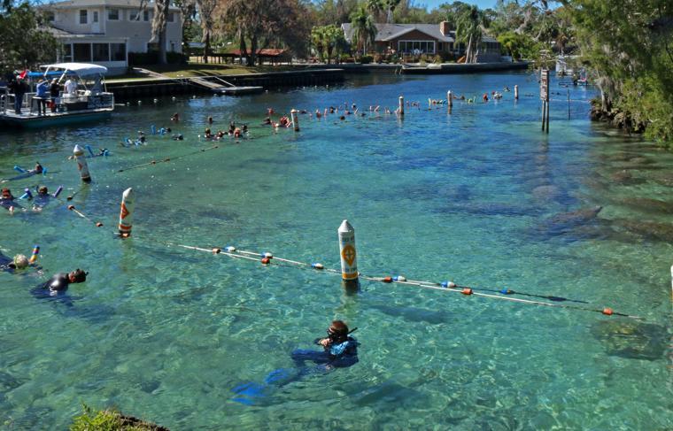 Swimmers and snorkelers watch manatees at Three Sisters Springs, FL.