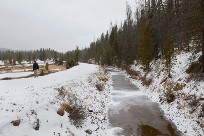 To truly understand someone, you must begin at her birth. So, Michelle and I spent two days looking for the Colorado River’s headwaters in the cold and snow above La Poudre Pass on the north edge of Rocky Mountain National Park. The pass was accessible by an unpaved, winding, pot-holed trek named Long Draw Road. It took us fourteen miles through pine and fir forests and past the frigid Long Draw Reservoir before ending abruptly in a flat where the red trunks and brown branches of winter willows braced themselves against the breeze.