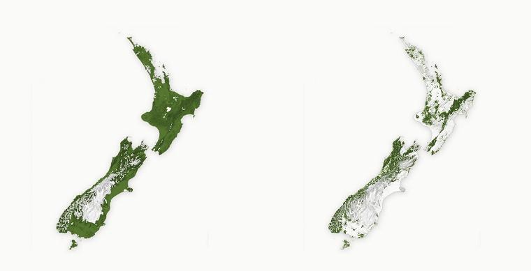 New Zealand forest cover at the arrival of humans, AD 1000 (forest cover around 80 percent), and today, AD 2000 (forest cover around 25 percent). Source: teara.govt.nz