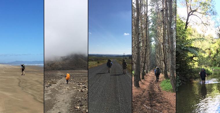 The varied trail: 90-mile beach, volcanic craters in Tongariro NP, farm road near Kerikeri, pine plantation, and Mangapukahukahu stream.