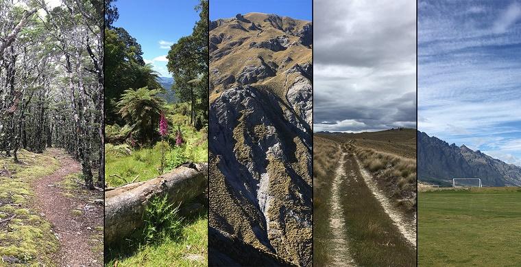 Man-made: The trail through beech forest, a Northland cow pasture, Motatapu sheep station, Otago roads, and a soccer field in Queenstown.