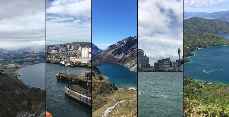 Water along the trail: Wanaka farmland, Wellington ferry terminal, Lake Constance, Auckland Harbor, and the Queen Charlotte Sounds.