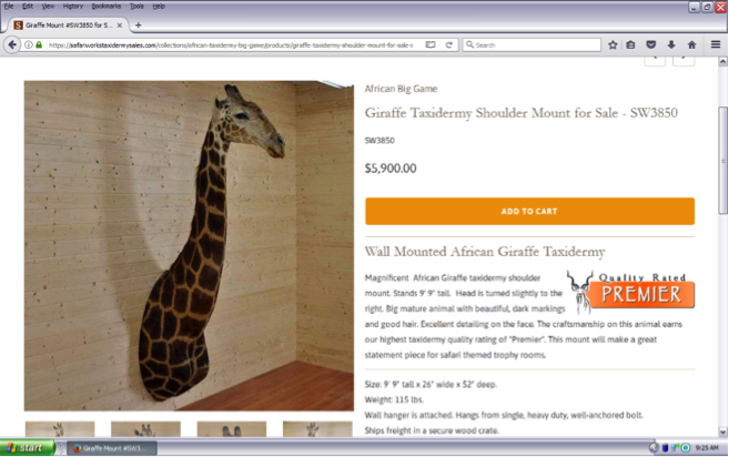 Giraffes (Giraffa camelopardalis) are categorized on the IUCN Red List as “Vulnerable” to extinction. One major threat to their survival is illegal hunting, especially of some subspecies that are “Endangered” or “Critically Endangered.” Some of that illegal hunting involves commercial gains for poachers that are facilitated by the movement of giraffe specimens across borders. To take one example, according to official US Government records, in 2012, 50 giraffe specimens were imported into the US from South Africa, but the country of origin of the body parts was Somalia. Only reticulated giraffes (G. c. reticulata) live in Somalia; hunting giraffes is illegal in Somalia; reticulated giraffes are classified on the IUCN Red List as an “Endangered” subspecies; their numbers have plummeted by at least 56%, and possibly as much as 78%, over the last thirty years; and only about 11,000 reproductively mature individuals exist in the wild. We have no way of knowing if the 50 giraffe specimens came from one or 50 animals, but the database conclusively demonstrates that giraffes are victims of an “international trade in endangered species”.