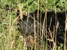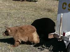 Most of the bears brought to Ramsay were orphaned cubs, but there were a few older animals. Despite looking appealingly cute, Ramsay warned that even a 15-pound cub “could tear your face off” if cornered. They were all black bears (Ursus americanus), ranging in color from cinnamon to dark chocolate. In the crowded pens, some of the cubs played or sprawled in the sun. Others hid or pawed at the wire frames to try to break free. A one-year-old male paced in his pen, letting us know his discomfort, wailing like an unhappy wind. Our small group had been invited to attend the darting, transport and release of five of these rehabilitated bears to a new location. This was the only time Ramsay permitted people to visit; in fact, she preferred a mob. Our job was to help scare the animals and make sure they associated people with being terrified.