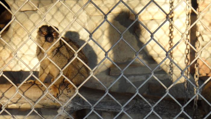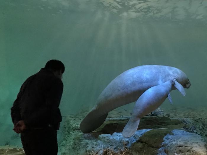 Some of the photos capture the forlorn reality of vanishing species. Two stone lions by a decrepit archway stare out at the sea. “There are more statues of lions on Earth than there are lions left alive in the wild,” reads the text underneath the image. A sad lemur stares from a tiny cage. A stuffed pronghorn head is used to hang an old boxing glove. Rattlesnake skins are for sale. Few photos show a person and a live animal together. A man in shadow peers into a silty aquarium tank at two manatees. He is the amorphous doppelganger of the big sea mammal. Perhaps only here, in the shadows of equal existence, can man and wild animal meet. But the manatees have already turned away.