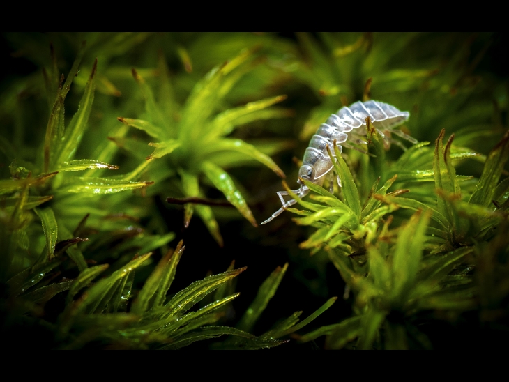 Photo 1: Wondrous Woodlouse: An isopod crustacean (also known as a woodlouse, roly poly or pill-bug) explores the depths of a thick mat of moss on the surface of a forest floor. About as wide as a pencil's eraser, isopods are crucial to soil ecosystem health — recycling dead organic matter back into the soil, and absorbing heavy metals.