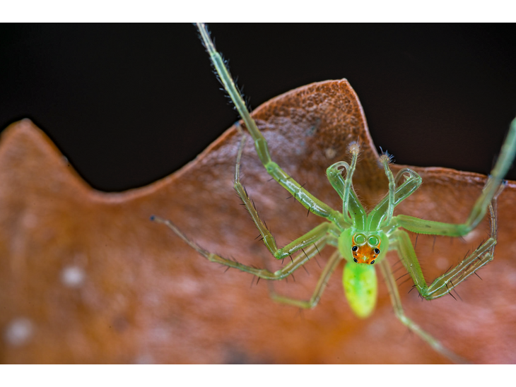 Photo 4: Jumping Spider: A male green magnolia jumping spider explores the underside of an oak leaf in a forest.