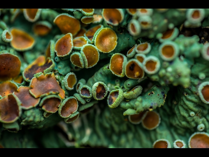 Photo 2: Apothecia Array: Upon closer inspection, a tree trunk in the Appalachian Mountains reveals a world of color, shapes and organisms that exist right beneath our noses. Lichens such asthis green foliose lichen with brown apothecia (reproductive structures) can be found on every continent! With around 20,000 species worldwide, these ecological underdogs play some very important roles in ecology, cultures, medicine and more.