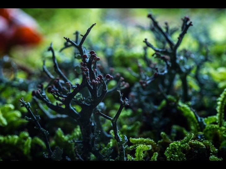 Photo 5: A Tiny Forest: A backlit forest of Cladonia lichens grows on a thick mat of moss in Western North Carolina. Lichens are very important (yet often overlooked) organisms with a plethora of benefits — from carbon sequestration to anti-cancer properties in some species.