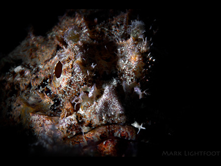 With his photographs, Mark does more than just document undersea life. Using unusual lighting, angles and close-up shots, he brings out new ways of looking at his subjects. "I try to give them dimension, bring out unique details, and in some cases show the personality of the creature," he says. His photograph "Hideous Beauty" illustrates this approach. In it, a scorpionfish gazes at the camera, part of its face hidden in shadow. Even divers that have seen a scorpionfish have likely never seen one like this. Mark got inches from the fish's face and took advantage of offset lighting to bring out remarkable detail and personality. The result is both frightening and beautiful.