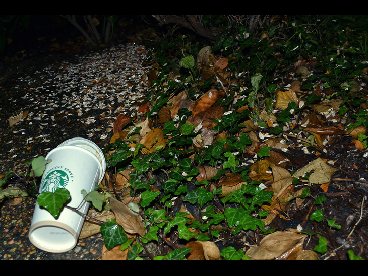 Each photo showcases some of the most common trash in the United States, and each caption shows the environmental damage that goes along with the type of trash in the photos. When viewing these images, I would like all Americans to associate the corporate products they buy – and then throw away – as having an effect on the environment. Some brand labels are intentionally out of focus or not the most easily viewed, as this shows just how commonplace the products are: General shape or color scheme can make many items recognizable. All of the items photographed here were found in trash and waste bins around Washington, D.C.