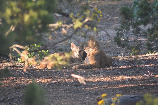 I’ve lived here since the mid-90s and had never seen a bobcat up close in person (despite the nearby restaurant called the Bobcat Bite) until last year. On the Fourth of July, 2016, several guests and I were rewarded with a magical experience in my backyard. Beyond the garden wall, I caught a flash of movement and ruddy fur in the thick juniper grove. As we tiptoed to the wall, a bobcat mom strolled out of the copse and sat nonchalantly on the concrete slab covering my water cistern, grooming and flicking her ears to better show the distinctive black-outlined white triangles on the back. She yawned in the afternoon heat as she watched the five human heads on the wall watching her and whispering about her beauty. When she strolled away, she was followed by three scampering, playful kittens.