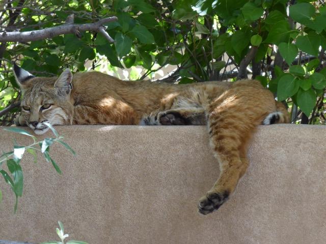 I suspect the clowder of bobcats, as a group is known, will surely be gone by the time I find the closest camera. But a few minutes later, as I walk out into the wild brush land behind my home, I hear another growl and turn to see her about 30 feet away, lounging on my adobe wall in the afternoon heat, for all the world like one of my indoor cats on the back of a sofa.
