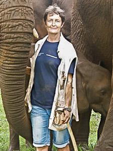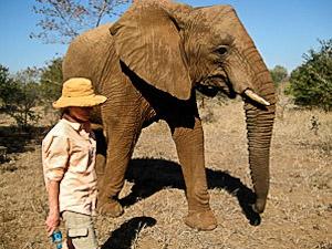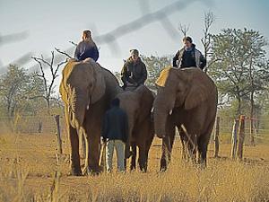 She invites me to ride Chitora, the biggest of the three elephants, from her nighttime paddock way out to the daytime grazing grounds. The idea of climbing onto her is exciting, but once I am actually sitting on her I see just how much further down the ground is than from the back of a horse. I’m unnerved at first, and she senses my bit of apprehension as I try to find the right spot to settle myself. Now Chitora’s huge ears blanket my legs on either side of her head, and I grip the top edges to keep my balance. I am doing my best to relax and feel the physical contact of my body with hers. As the days pass, I will feel more and more at home with her.