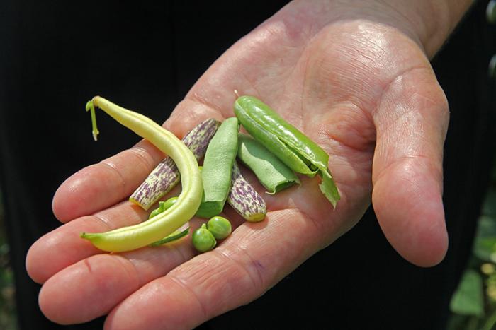 Dalila muestras frijoles autóctonos, recién recogidos en el huerto.