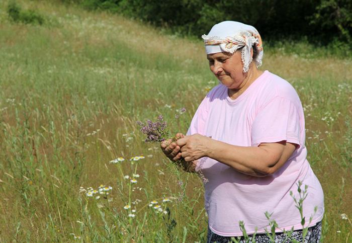 La madre de Dalila recoge tomillo silvestre en el prado que está junto a su huerto.