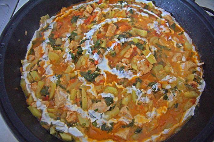 Un delicioso guiso de pollo y pimiento bosnio con un chorrito de kajmak blanco.