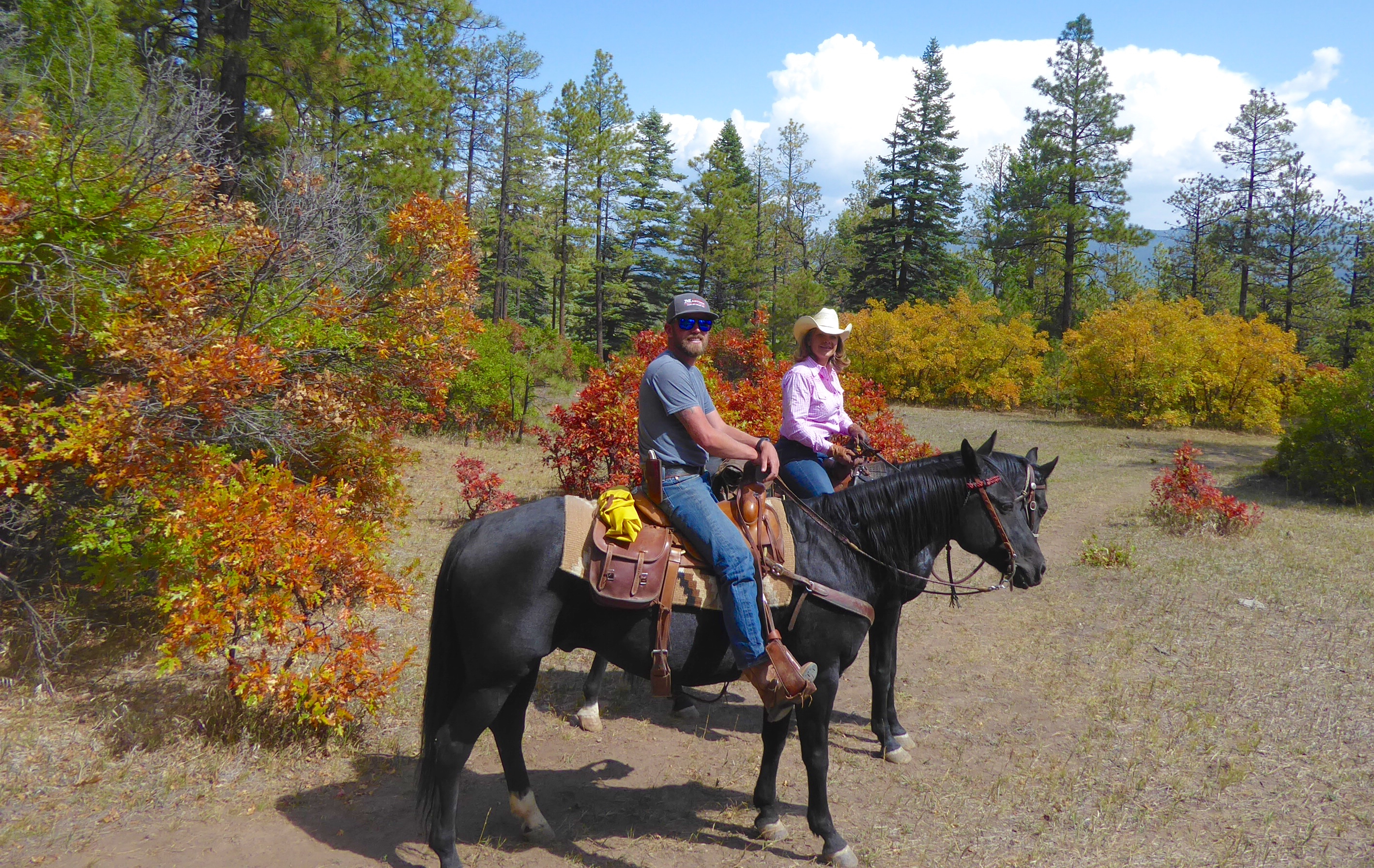 On the first day of autumn, I’m riding through a changing forest — tall, deep green ponderosas interspersed with the butter-gold of aspens, and shrubs ranging from pale crimson to deep russet to coral orange. It’s good to be on Charlie horse again, riding up and down the steep winding trails off Forest Road 476 in the mountains above Taos, New Mexico, after a summer hiatus from riding while I waited in vain for the heat to abate and the summer monsoon rains to start.