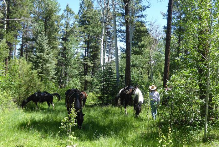 The next day is the first day of autumn. After saddling up Charlie at Kimberly’s barn, I meet her and RJ at the trailhead. We’re soon in an autumn wonderland, well above the endlessly smoky skies that have plagued New Mexico and most of the American West for the past few weeks due to the mega-fires on the West Coast. I try to overlook how dry the land is, but can’t help noticing that the streams are silent and the stock tanks, other than the spring-fed one, are dried up. The grasses just never grew this year, and Kimberly says there were a lot of cattle in the forest (hers were pastured in Velarde this year) so what we are seeing is partly the result of overgrazing.